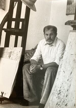 Rudolf Hradil travaillant à un collage chez ses parents, vers 1952